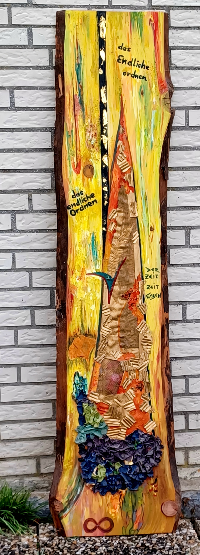 Das Endliche – Darstellung im Stile eines Totenbretts (Fichtenholzbrett, Acryl, Papier, 161 x 42 cm)